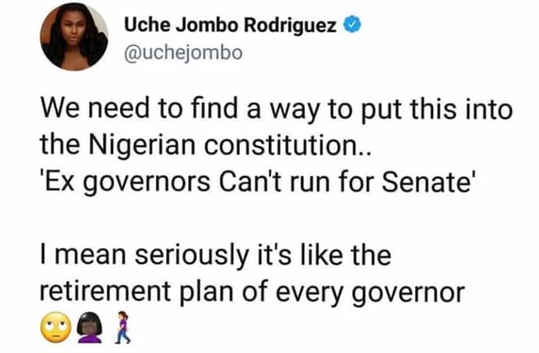 “We need to find a way to put this into the Nigerian constitution.. ‘Ex governors Can’t run for Senate’ I mean seriously it’s like the retirement plan of every governor”.