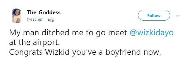 She is accusing her the said gentleman of ditching her just to be among the tumult of crowd to first witness Wizkid’s arrival yesterday.
