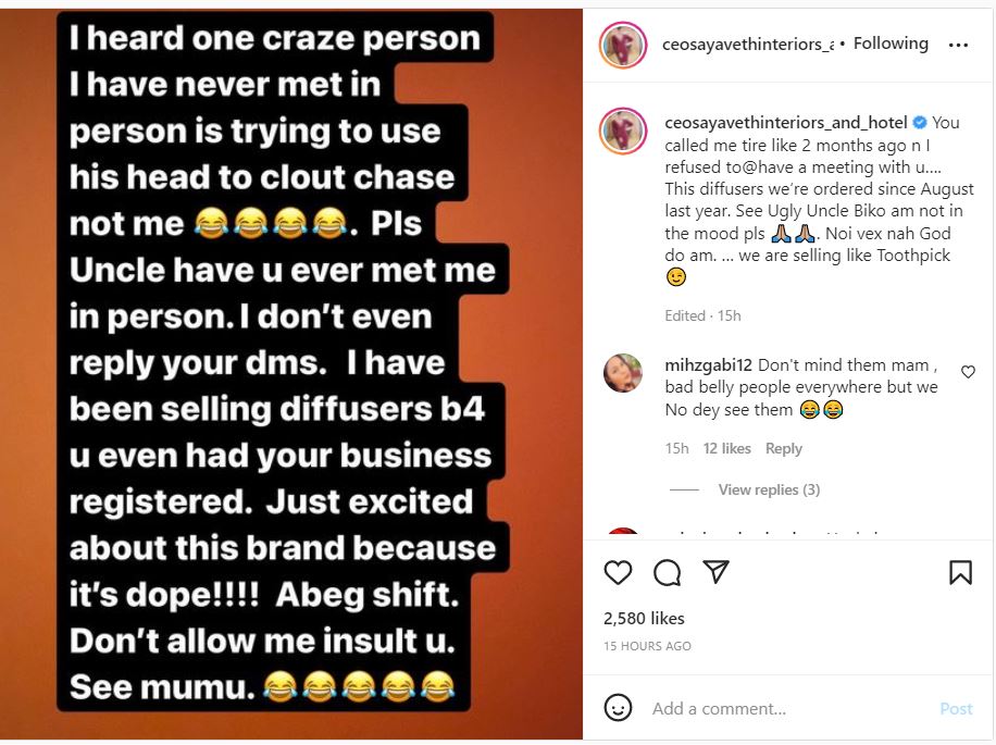 “I heard one craze person I have never met in person is trying to use his head to clout chase not me. Pls uncle have you ever met me in person. I don’t even reply dms. I have been selling diffusers b4 you even had your business registered. Just excited about this brand because it’s dope!!! Abeg shift. Don’t allow me insult you. see mumu.”