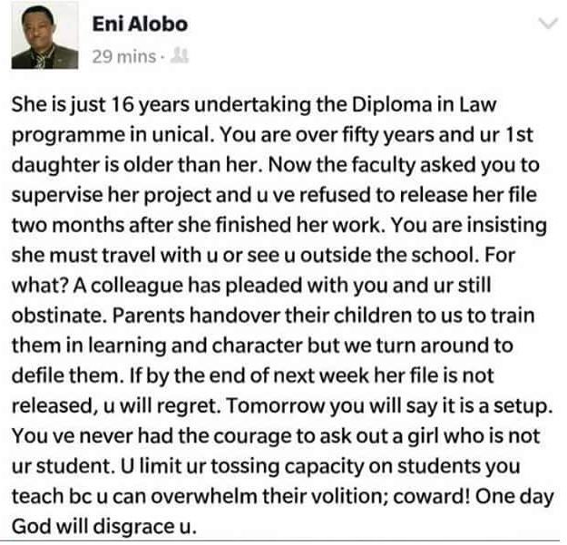 Dr Eni Alobo, a lecturer and Head of Department in the Faculty of Law of the University of Calabar (UNICAL), has took to social media to threaten an unnamed colleague who has been harassing a 16-year-old student, s*xually.