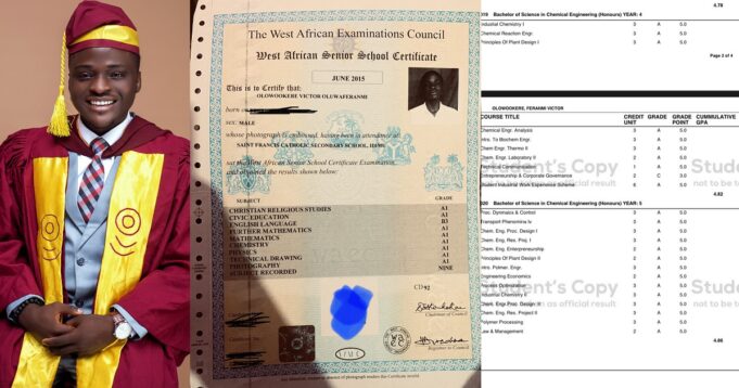 The gentleman shared side by side photos of his result before getting into the varsity and as he graduates – the grades in his result is what has netizens jaw dropped with many congratulating the young chap for achieving such glorious feat.