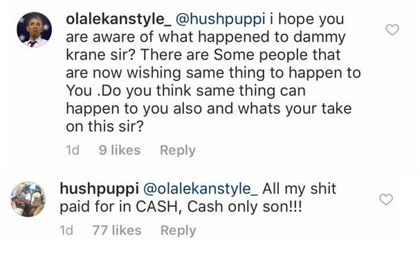 ..and Hushpuppi response thus; “@olalekanstyle_ All my shit paid for in CASH, Cash only son!!!”