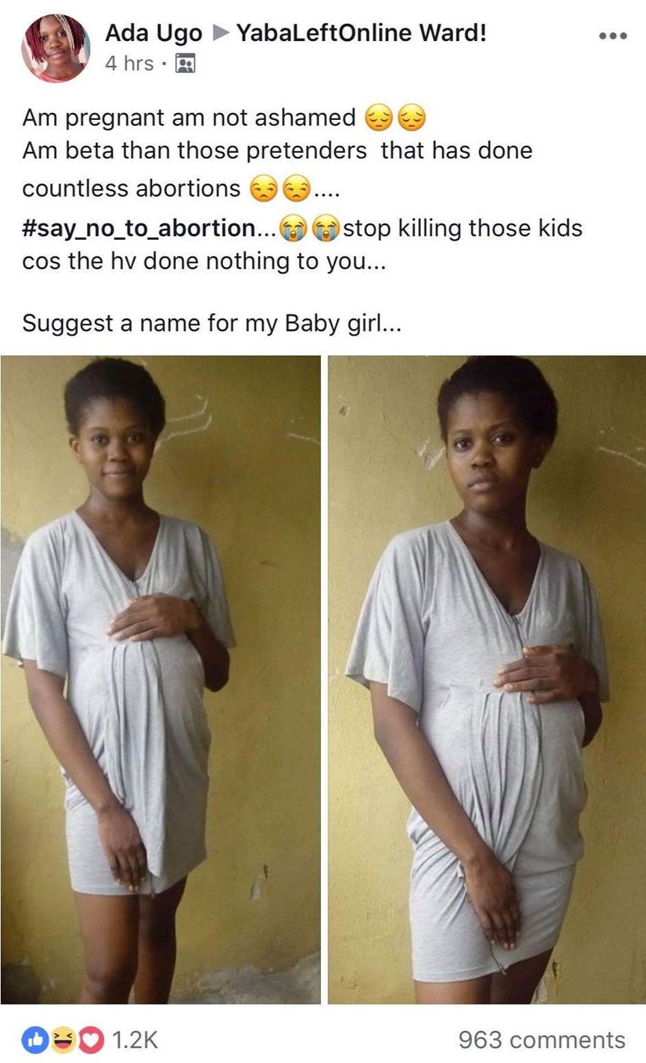 Sharing a photo of herself with her baby bump on Facebook, she admonishes ladies to stop aborting babies before she then asks users to suggest a name for her baby girl.