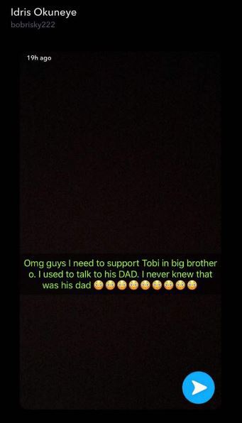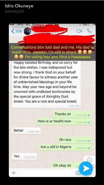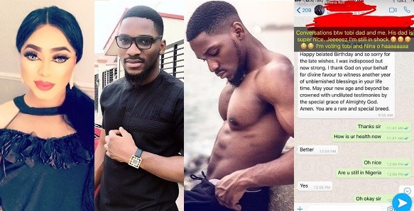 Controversial King of Snapchat, Bobrisky is claiming he speaks to Tobi’s Billionaire Banker Father, and he’s even shared a chat he recently had with him.