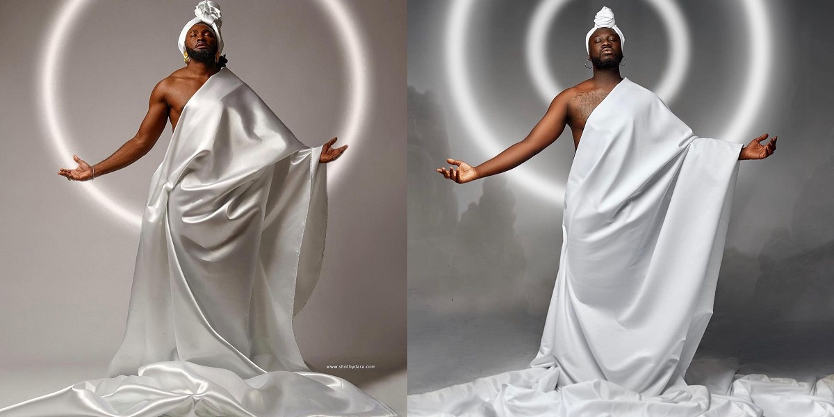 Recall that in the Jesus-themed picture, Uti draped a white satin cloth across his body and tied a white scarf around his head with minimal jewelry.