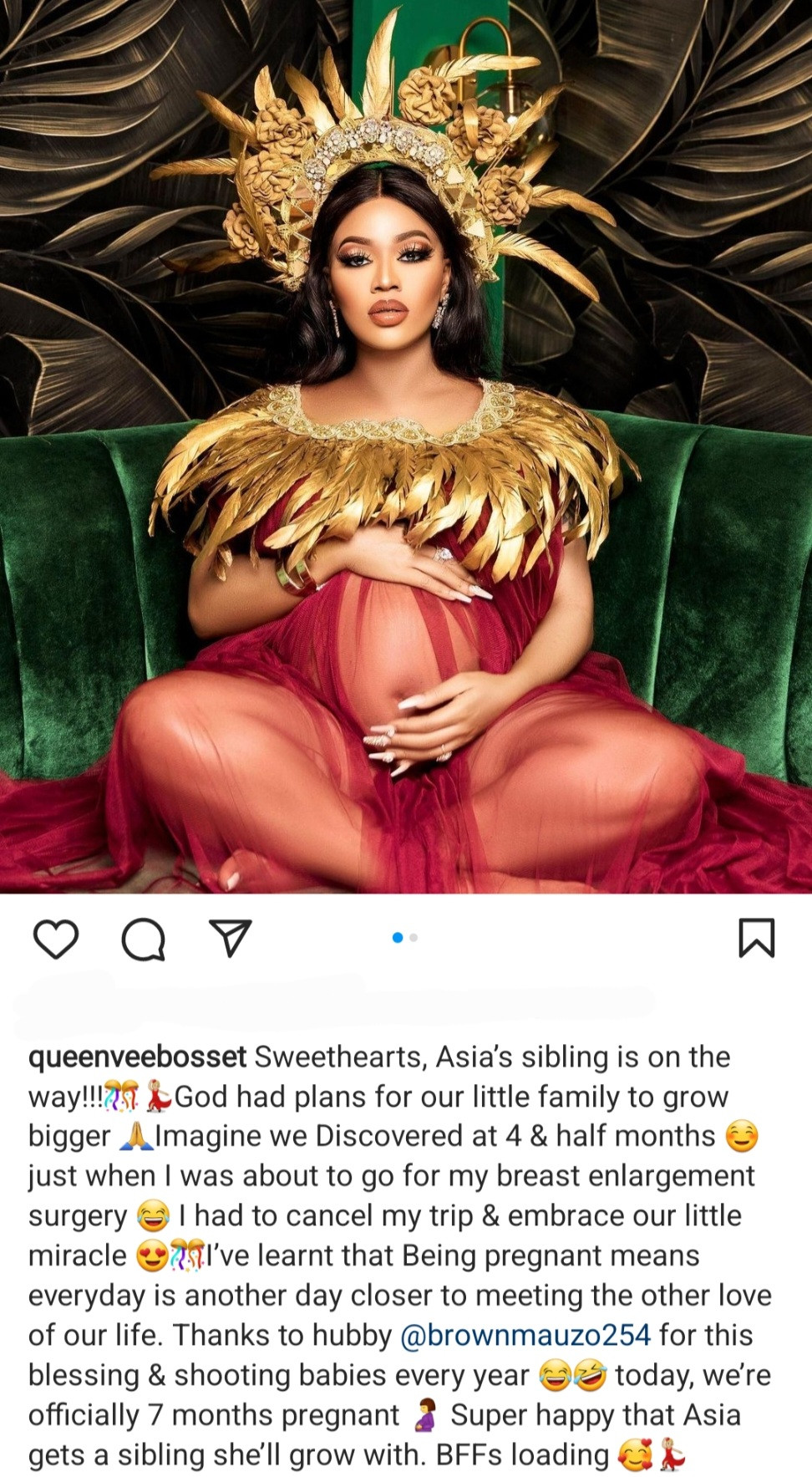 “Sweethearts, Asia’s sibling is on the way!!!🎊💃🏼God had plans for our little family to grow bigger 🙏Imagine we Discovered at 4 & half months ☺️ just when I was about to go for my breast enlargement surgery 😂 I had to cancel my trip & embrace our little miracle 😍🎊I’ve learnt that Being pregnant means everyday is another day closer to meeting the other love of our life. Thanks to hubby @brownmauzo254 for this blessing & shooting babies every year 😂🤣 today, we’re officially 7 months pregnant 🤰 Super happy that Asia gets a sibling she’ll grow with. BFFs loading 🥰💃🏼”