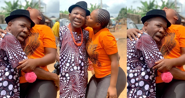 Nollywood curvy actress, Destiny Etiko got a bit cosy with veteran comic actor, Chiwetalu Agu and he laid his head on her chest on set of a new movie.