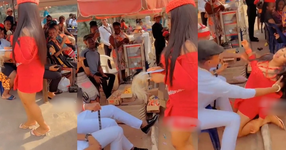 A Nigerian bride has caused a buzz online after collapsing to the ground while performing a traditional wedding ritual.
