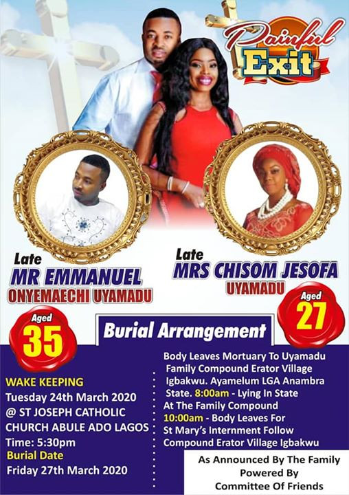 Emmanuel Uyamadu, 35 and his pregnant wife, Chisom Uyamadu, 27, were among the number of people who lost their lives in the explosion that rocked Abule-Ado community, in the Amuwo Odofin Local Government Area of Lagos State, on Sunday, March 15.