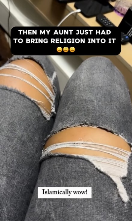 She disclosed that the African women were indirectly telling her what outfit she should wear as she persistently convinced them that the ripped jeans were fitting. Her aunt shows concern about a Muslim lady dressed in ripped jeans.
