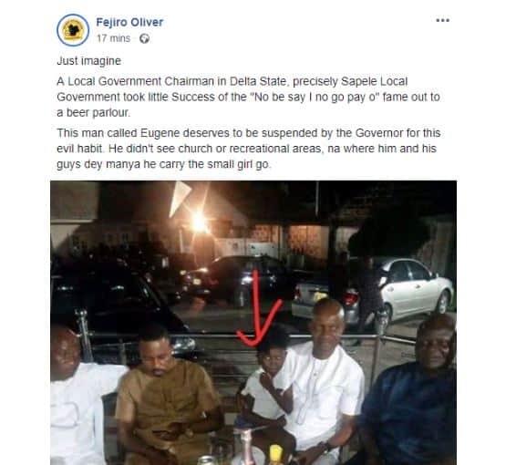A Journalist identified as Fejiro Oliver, has taken to facebook to call out the chairman of Sapele Local Government, Eugene Inoaghan, for taking little Success Adegor, to a beer drinking gathering with his friends.