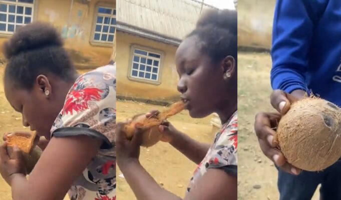 Lady stunned as her neighbor tears a coconut open using her teeth (Video)