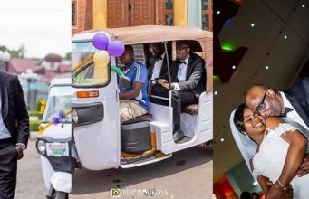 Dapper looking groom rides in customized Keke Napep to his Church wedding in...