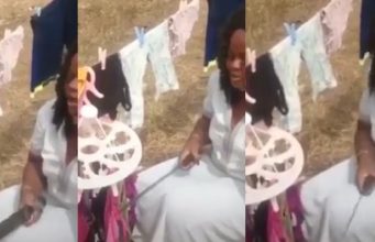 Nigerian lady monitors her panties with cutlass while sun drying them (Photos)