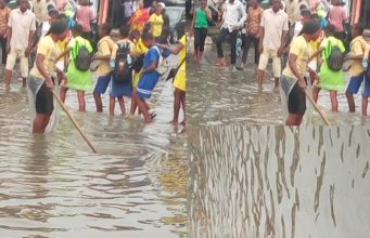 Lady spotted under the rain helping school children cross flooded market in Port...