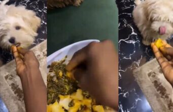 Pet dog enjoys ‘vegetable and pounded yam meal’ due to expensive dog food...