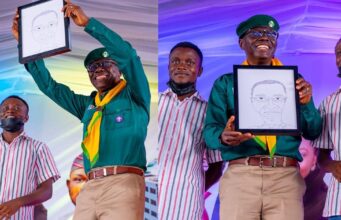 Lagos State Governor, Sanwo-Olu heartily receives caricature drawing made of him by an...