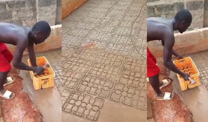 “Omo e con be like Inter lock” – Bricklayer wows many as he creates interlock design with mineral crate...