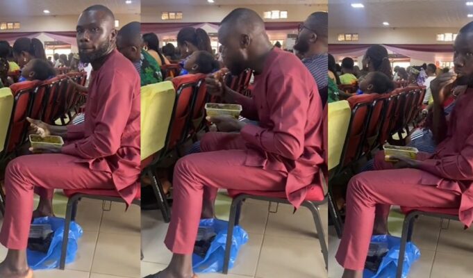 “eating both physical and spiritual food” – Nigerian man shamɘlessly devours vegetable soup and ‘akpu’ in church during the...