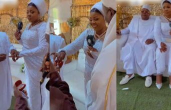 Nigerian mum tries to cover her daughter’s cleavage as she blesses her during her...