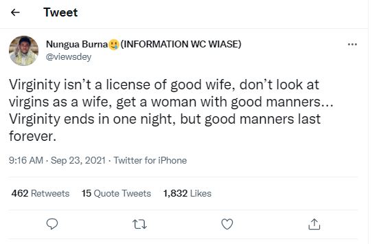 According to the user with handle, Nunga Burna @viewsdey, guys shouldn’t use virginity as a criteria to get a spouse but rather ensure they get a woman with good manners.