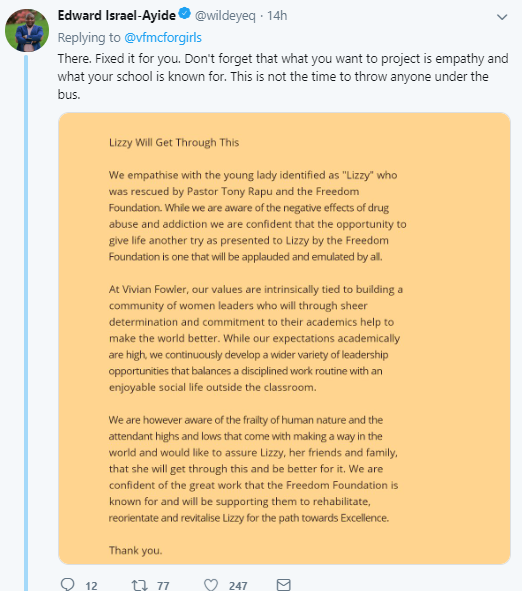 After the video went viral, Vivian Fowler issued a statement on Twitter. In the statement, they denied that Lizzy ever attended their school but said they will work with Freedom Foundation to ensure Lizzy gets the help she needs.