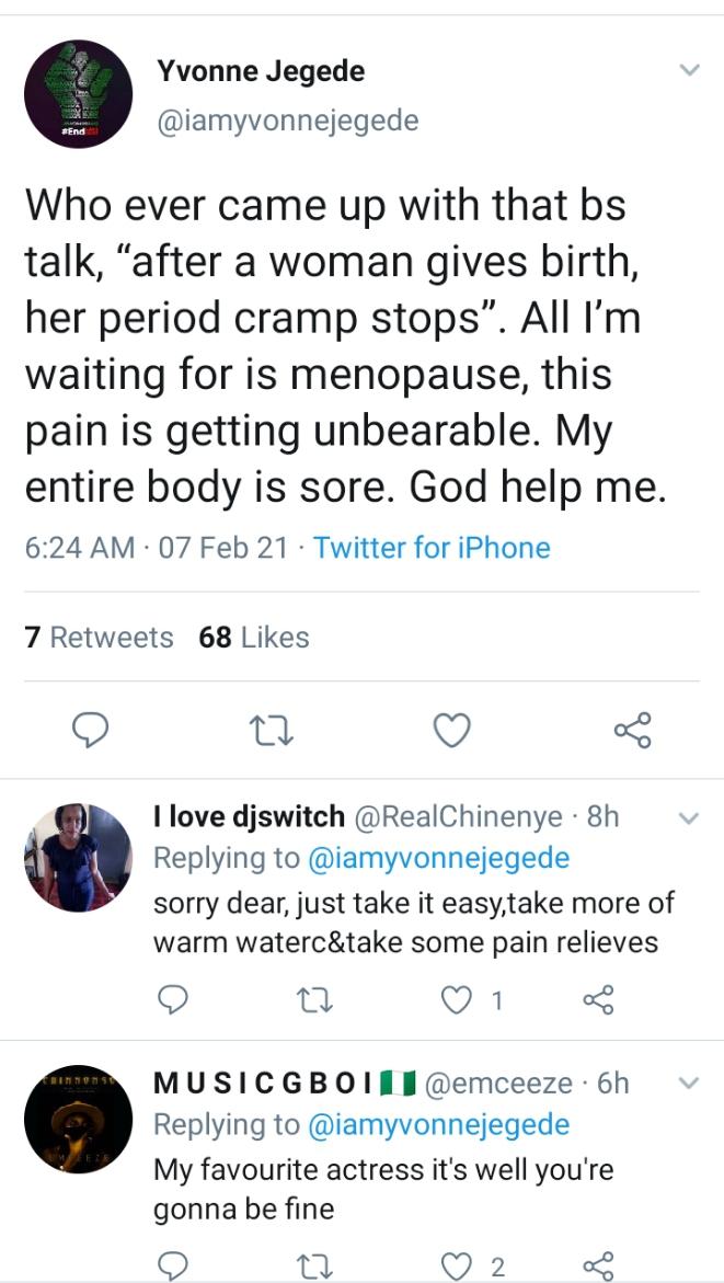 Recounting the painful experience Yvonne revealed her body feels sore from the period cramps, and knocked off those who say period cramps stop when a woman gives birth.