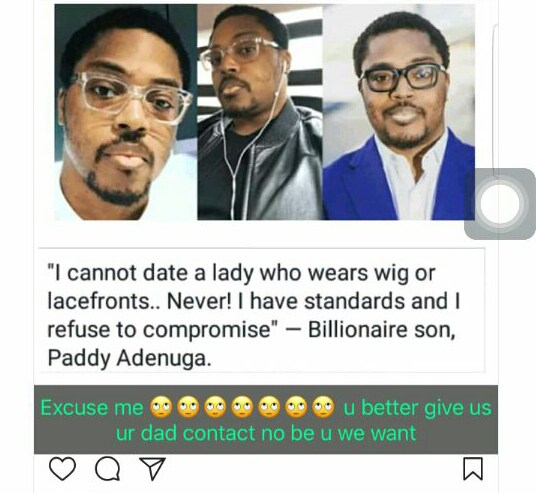 Paddy says there’s no way he’d date a lady with wigs or laces. In his words; “I can’t date you if you wear wigs or lace fronts.. never! I have standards and I refuse to compromise”