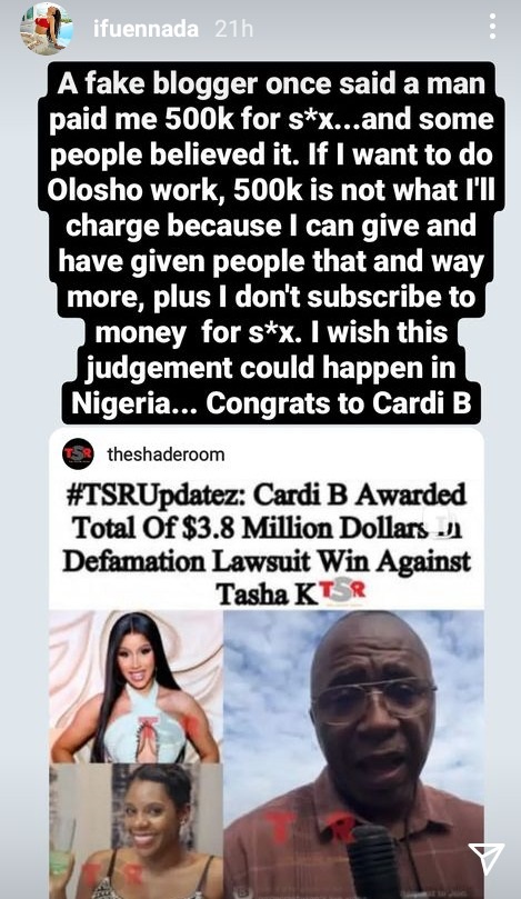 Ifu, who emphasized that she doesn’t subscribe to money for sex, said that N500k is too small an amount to have claimed she collected in exchange for sex.