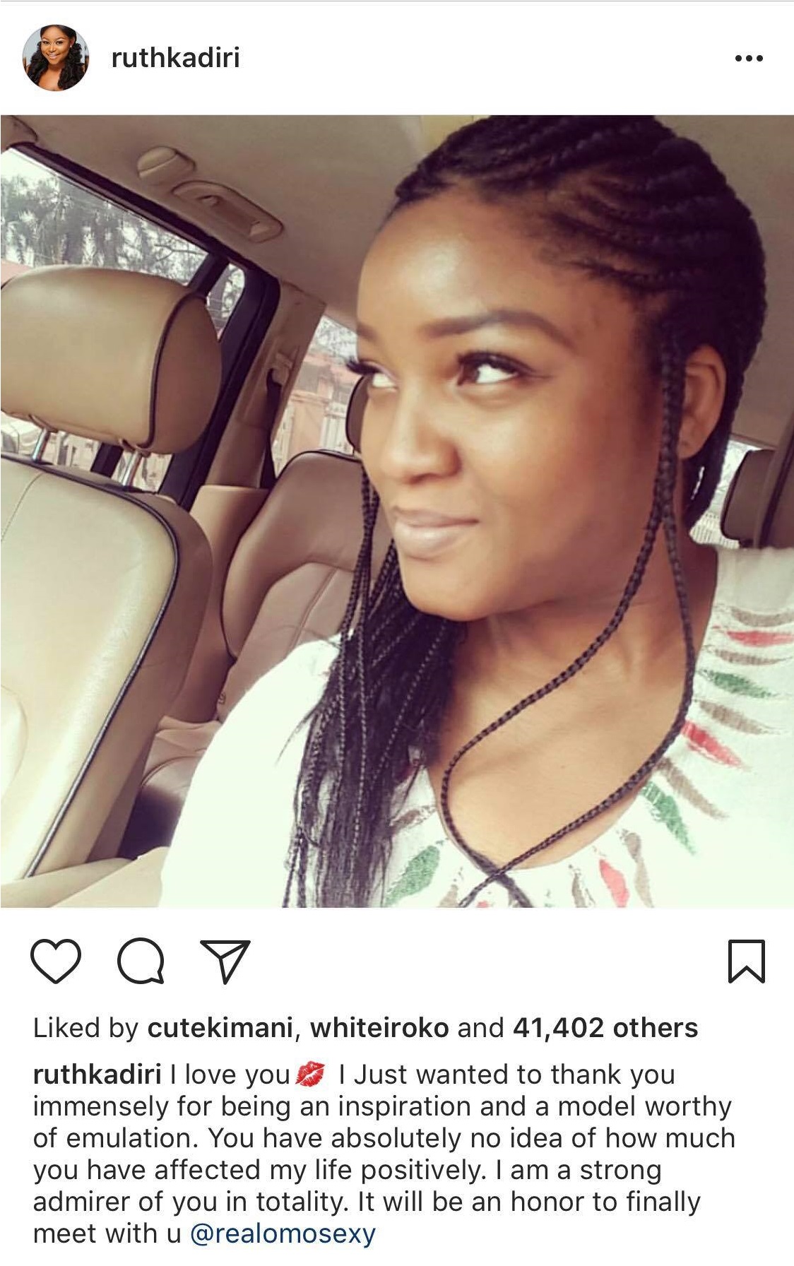“I love you? I Just wanted to thank you immensely for being an inspiration and a model worthy of emulation. You have absolutely no idea of how much you have affected my life positively. I am a strong admirer of you in totality. It will be an honor to finally meet with u @realomosexy”