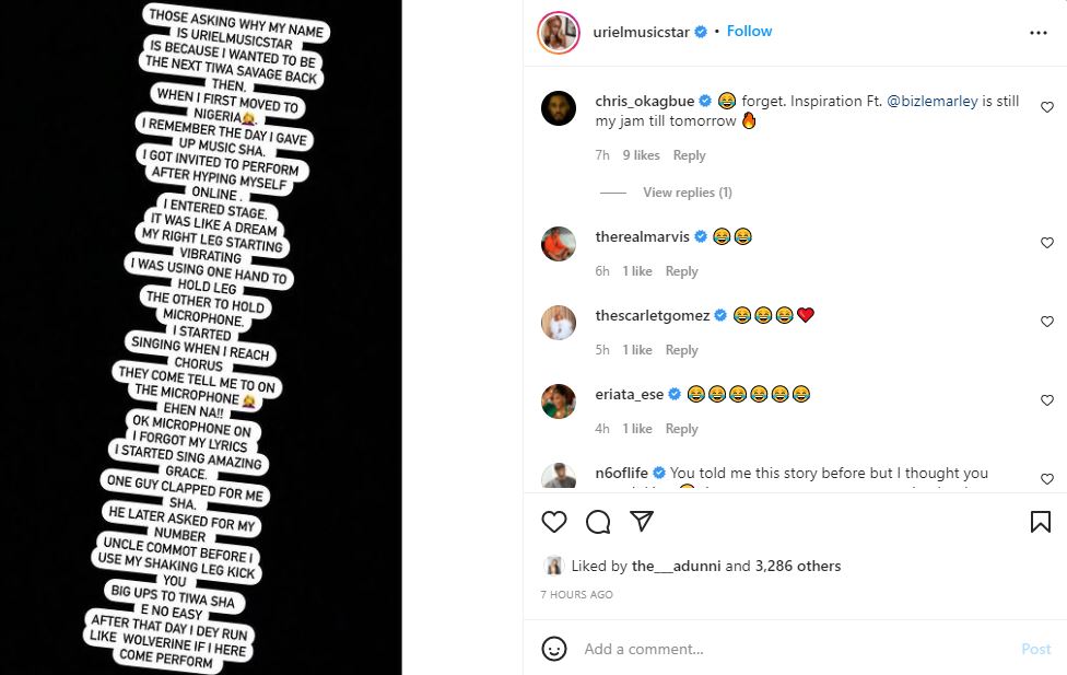 “Those asking why my name is Uriel music star is because I wanted to be the next Tiwa savage back then.