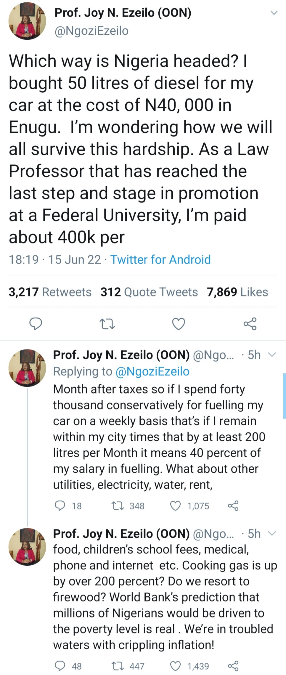 “Which way is Nigeria headed? I bought 50 litres of diesel for my car at the cost of N40, 000 in Enugu. I’m wondering how we will all survive this hardship. As a Law Professor that has reached the last step and stage in promotion at a Federal University, I’m paid about 400k per