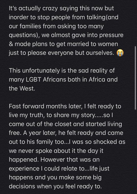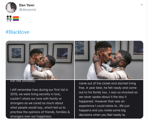 According to @danyomi, he and his boyfriend almost gave in to societal pressure of marrying women even though they were based in a country where homosexuality was legalized. They also expressed happiness of being able to explore their love together.