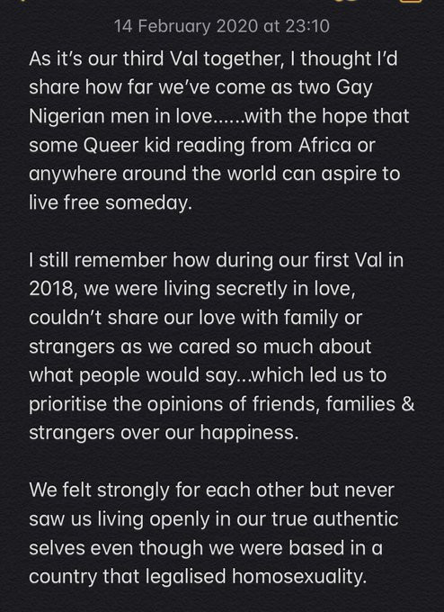Two Nigerian gay men who celebrated their third Valentine together last week, took to social media to pen down a post on how difficult it was for them to come out as gay men.
