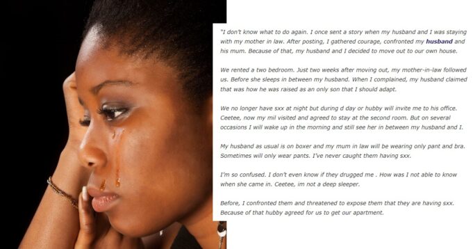 A distraught wife has taken to a social media page to seek marital advice as she revealed that her Mother-in-law’s love for her Son whom she is married to is having a toll on their marriage.