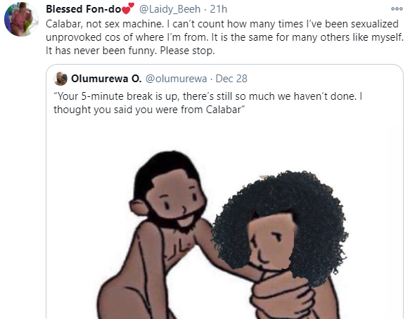 “Calabar, not sex machine. I can’t count how many times I’ve been sexualized unprovoked cos of where I’m from. It is the same for many others like myself. It has never been funny. Please stop.”