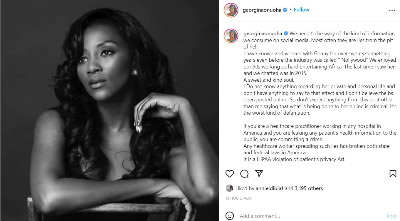 Nollywood actress, Georgina Onuoha, has responded to reports that actress Genevieve Nnaji is suffering from a mental illness.