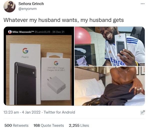 She added; ”I know y’all think it’s cute i got my husband the Pixel 6, but the truth is, you can’t put a price on peace of mind.”