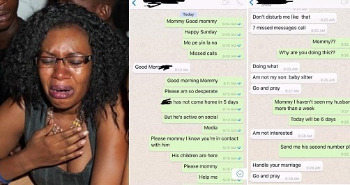 I married into a family of wickedness. I need to talk to someone. I can’t do this again. My son has been asking for his father. I am so weak. There’s this girl I think he’s with. She’s a corper but I don’t know her name or handle. I have been driving round to see where I can find him. God help me.”