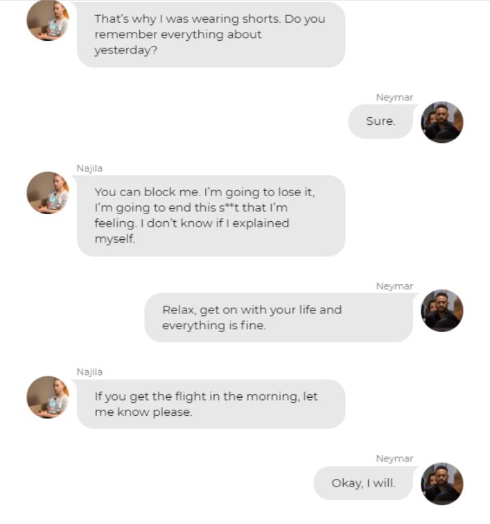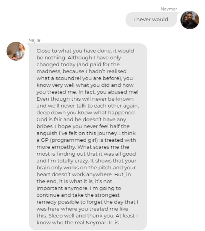 This comes after Neymar had taken to Instagram to share a video explaining himself and revealing WhatsApp conversations between the pair, as well as photos of Najila. He denied raping her but admitted that what happened between them was consensual.