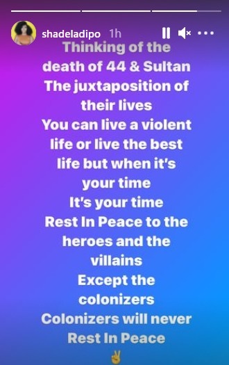 In her words, “Thinking of the death of 44 & Sultan the juxtaposition of their lives. You can live a violent life or live the best life but when it’s your time it’s your time. Rest in peace to the heroes and the villains’.