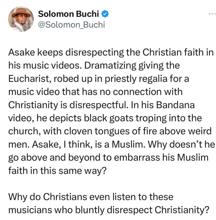 Social media commentator, Solomon Buchi alleged accused Afrobeats singer, Asake for disrespecting the Christian faith in his newly released music video.