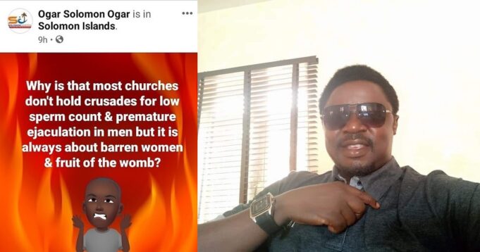 Nigerian journalist, Solomon Ogar, has taken to his facebook page to ask a very interesting question concerning churches holding crusades for woman to have ‘the fruit of the womb’.