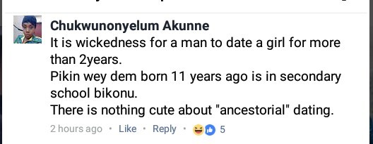 Calling that kind of relationship “ancestral”, Chukwunonyelum Akunne on Facebook says within a period of 11 years, a child born at the beginning of their relationship is already in secondary school.