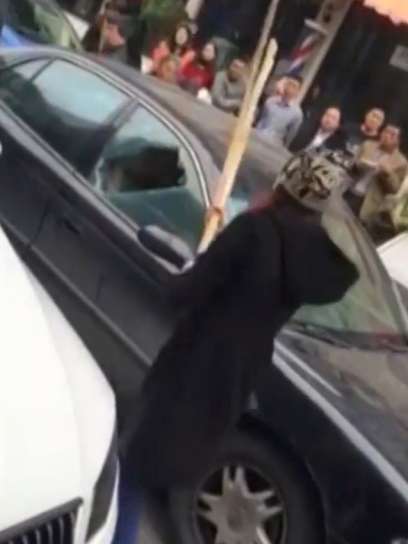The woman was captured in a video attacking her husband’s vehicle with sticks, smashing the drivers’ window as shocked bystanders look on.