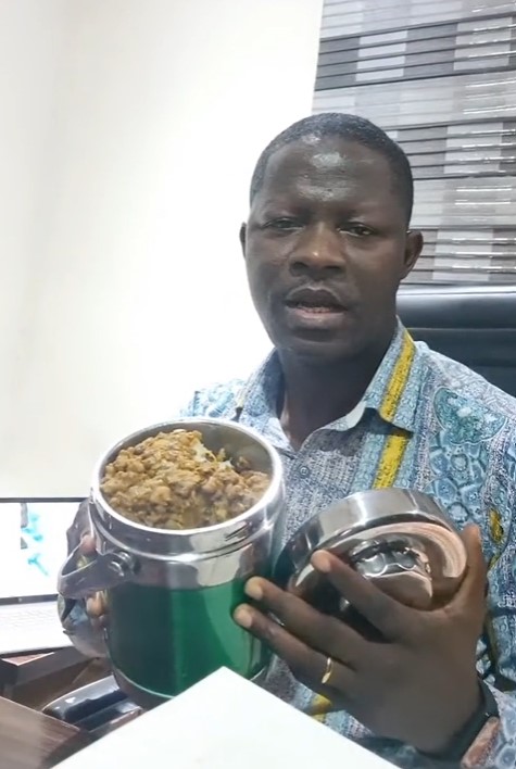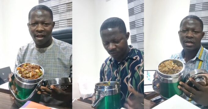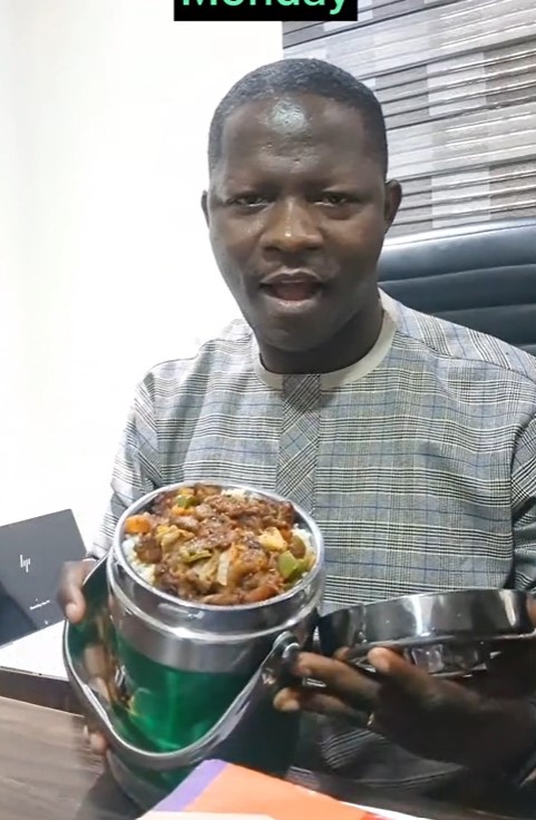 In the trending clip showing the man in his office, he flaunts the meal his wife prepares for him daily. He revealed each meal with the days of the week. Every delicacy has a specific day attached to it.