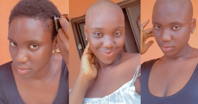 The video which has gone viral on social media reveals the the lady using a chargeable clipper to shave off, hair making her bald. She had to shave off her hair in order to wear the wigs.