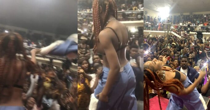 Budding Nigerian music act, Ayra Starr put on quite a show for her fans at the University of Benin, as she took off her jacket while performing on stage.
