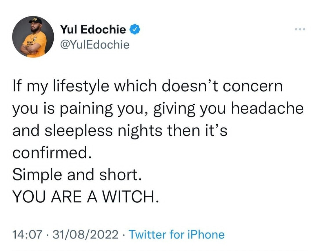 “If my lifestyle which doesn’t concern you is paining you, giving you headache and sleepless nights then it’s confirmed. Simple and short. YOU ARE A WITCH.” He wrote on Twitter.