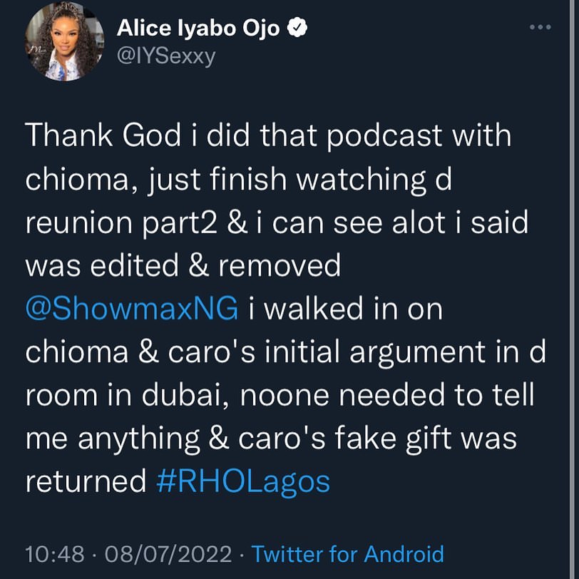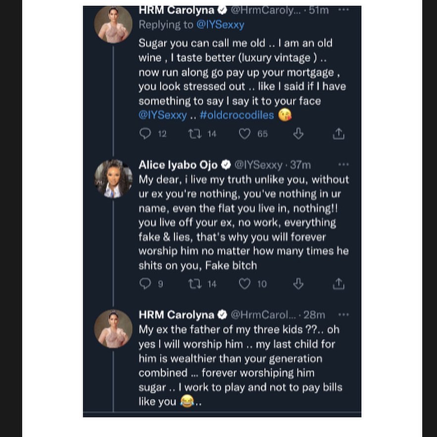 The mom of two also alleged that Carolyn is being bankrolled by her ex-husband, Musa Danjuma, which explains why she doesn’t respect women who work hard from their earnings.
